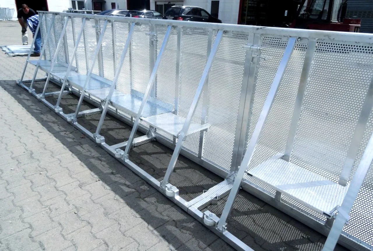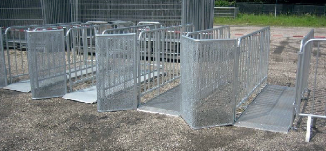 Crash Barriers, Wellenbrecher, Bühnengittermit Kabeltüren und Ecken.